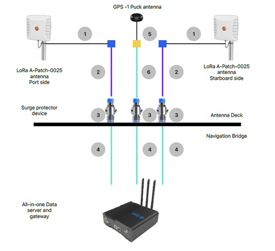 This diagram shows how bridge-mounted LoRa antenna communicates with the onboard sensors, enabling reliable data transmission across the vessel for monitoring and control purposes.