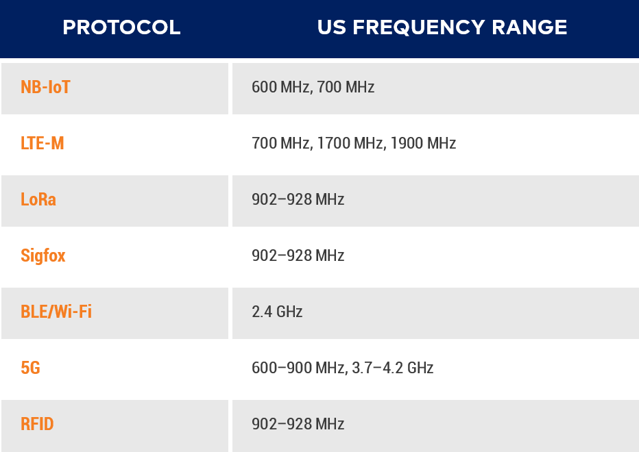 IoT devices operate across a wide range of wireless frequencies, far beyond typical mobile phone bands. Examples include: